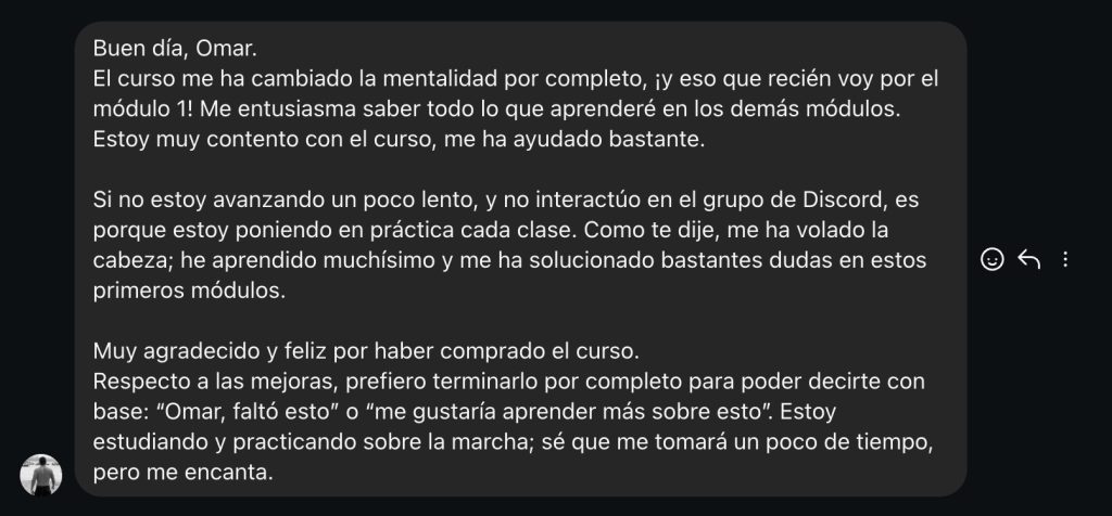 En este módulo de bienvenida descubrirás cómo funciona la mentoría, cómo usar Discord para resolver tus dudas y recibir feedback en 24h, y en qué orden empezar los módulos.